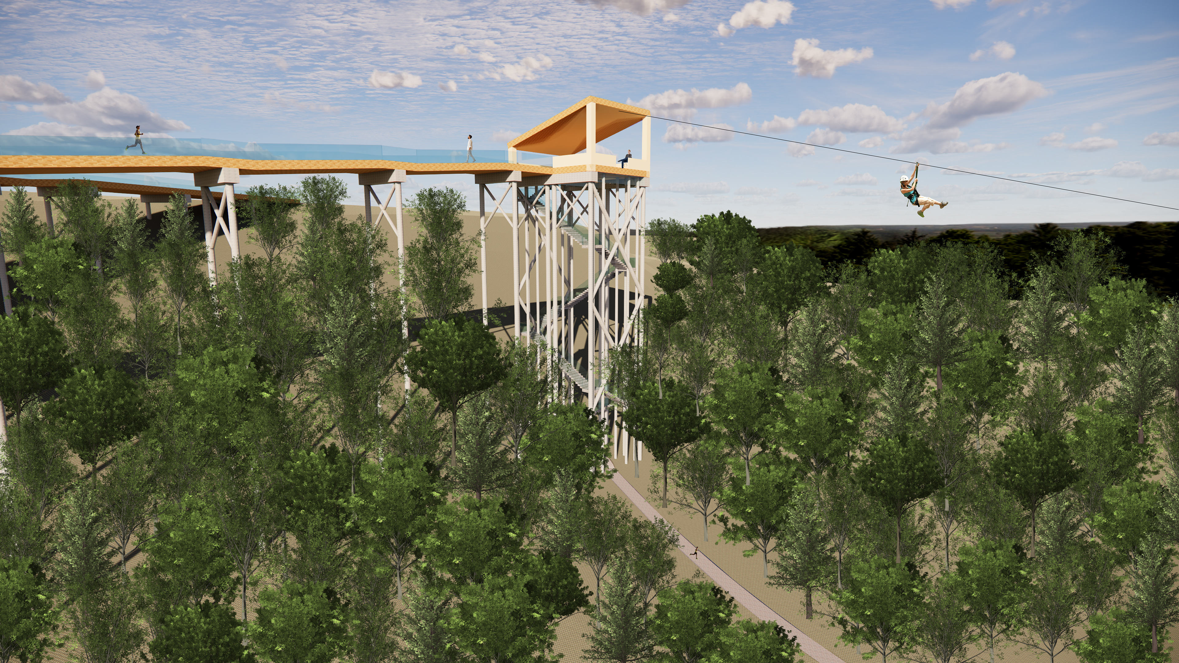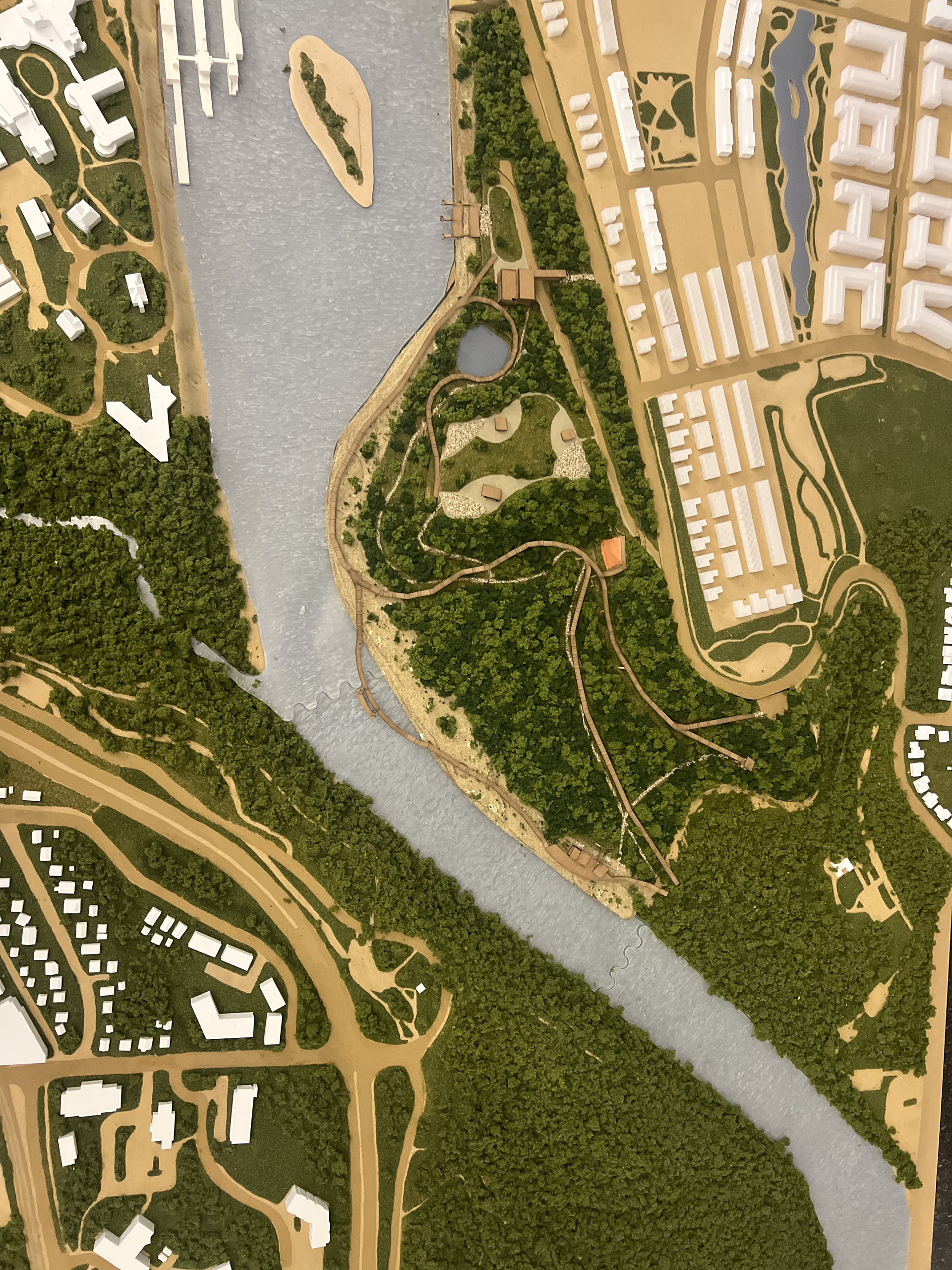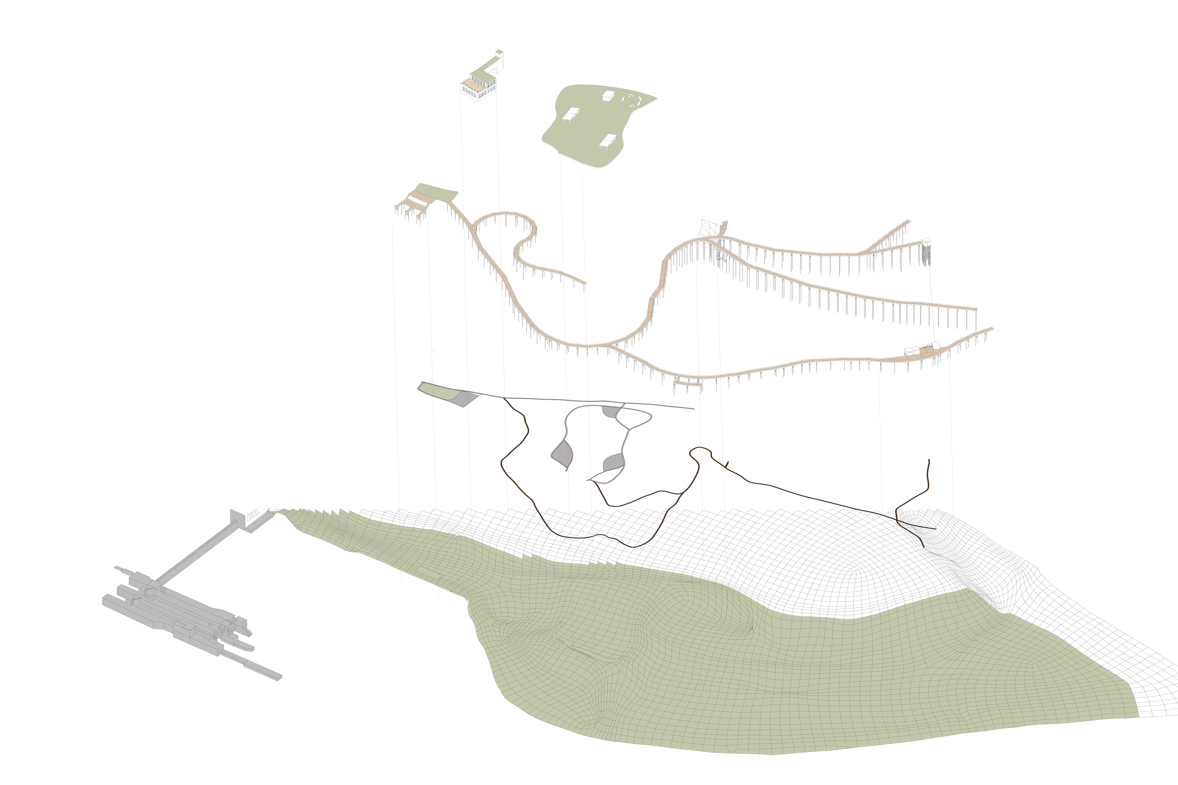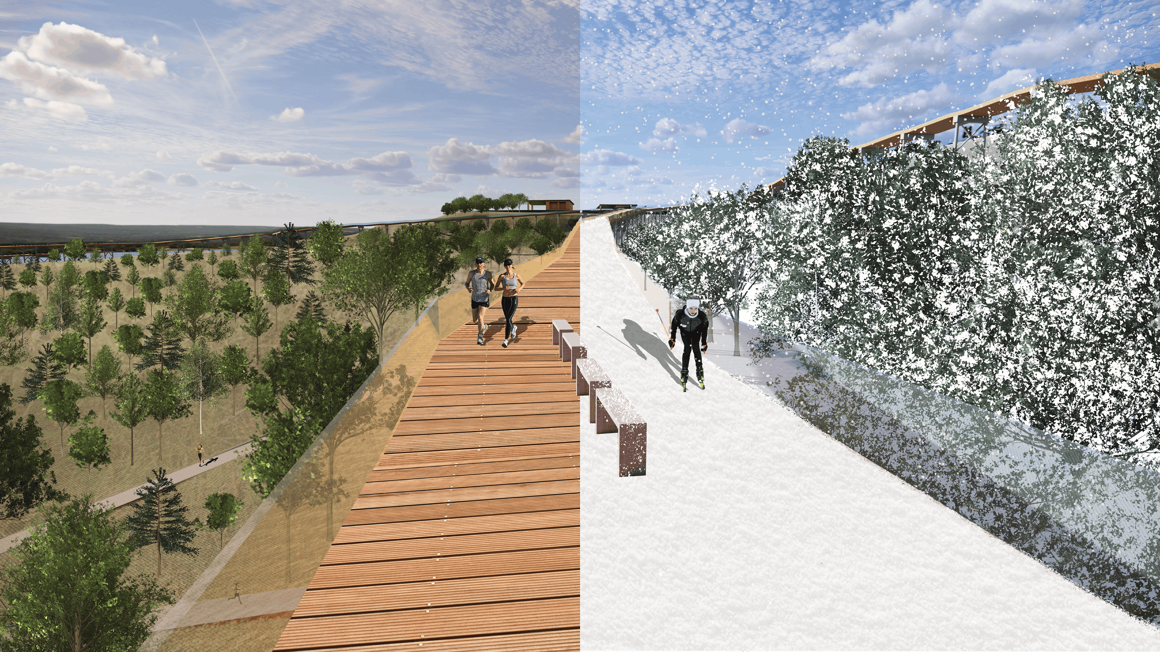 For this project, we were tasked with a design intervention for the Ford Area C site, which is on a contaminated floodplain. Our design intervention included elevated sloped boardwalk paths for multi seasonal recreational use, with programs such as cross country skiing, running, biking, skateboarding, etc. The existing Ford Steam Plant building is converted into an equipment rental facility with a cafe and rest area.